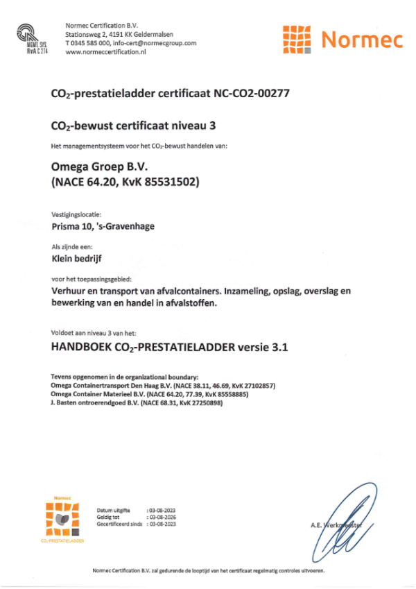 Omega Containers voldoet aan alle wettelijke eisen die aan afvalverwerking worden gesteld en onderschrijft deze ook. Wij zijn gecertificeerd op het gebied van: